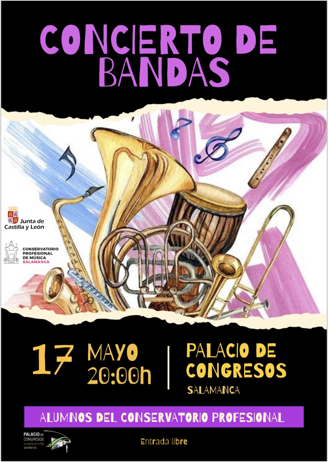 Este viernes 17 de mayo a las 20:00 h, tendremos las audiciones del 3º trimestre de las Bandas del Conservatorio Profesional de Música de Salamanca( Elemental, Profesional 1º a 3º y Profesional de 4º a 6º). Obras de Willian Owens, Rodrigo Tejedor Corredera, Alfredo Javaloyes….y como broche final se interpretará la 4º Sinfonía de Johan de Meij con coro de niños y soprano.
